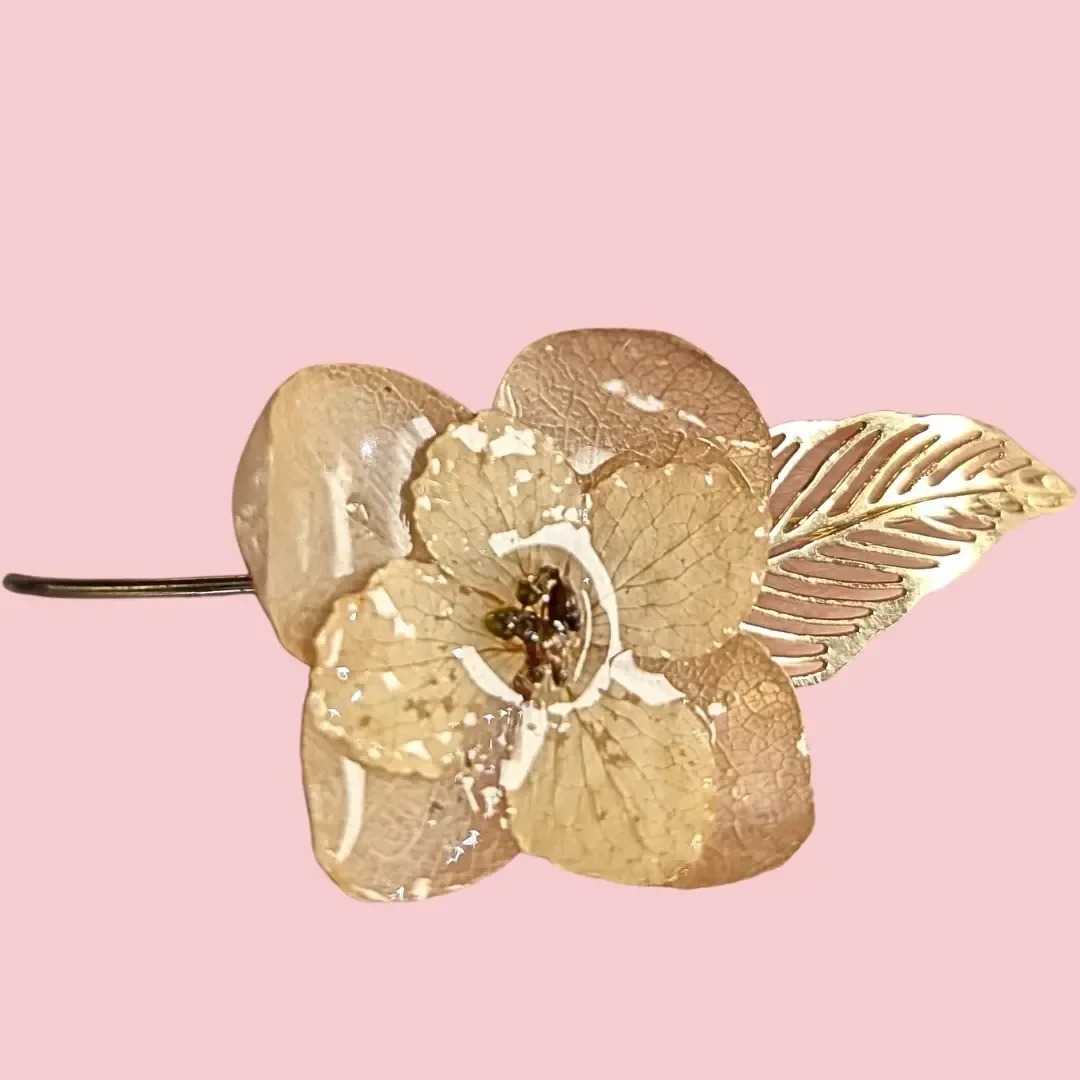 Idéal pour celles qui recherchent un bijou naturel, doux et élégant, ce bracelet plaqué or avec hortensia café latte est une ode à la beauté florale, alliant simplicité et raffinement.